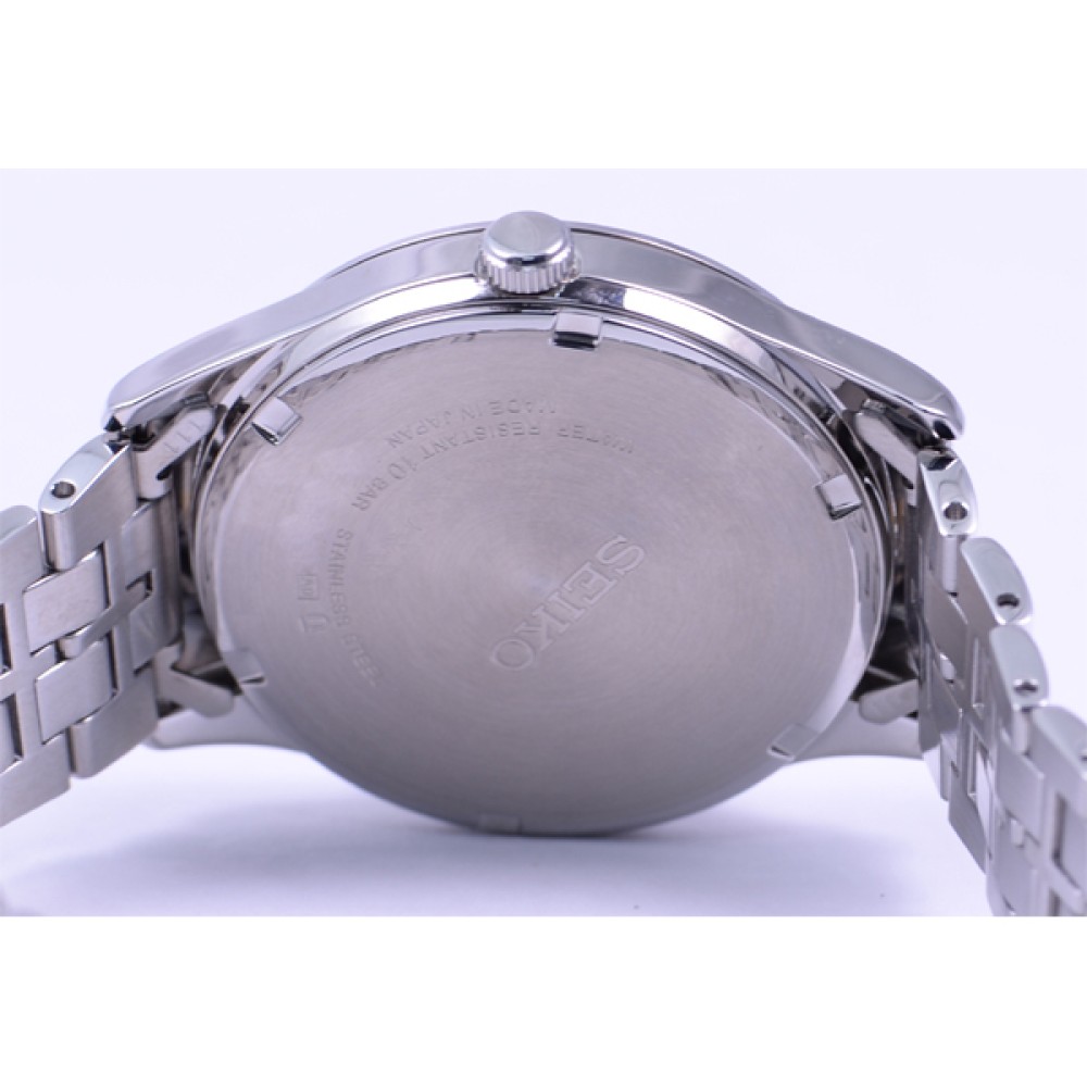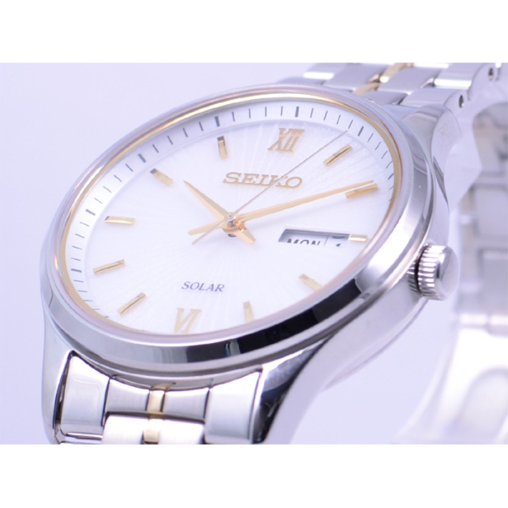 Seiko Selection SBPX071 - men's watch made by Seiko. It is equipped with Japanese solar quartz movement and V158 calibre. Stainless steel, gold plated case of round shape. Case dimensions are 38 mm. in diameter and 9.5 mm. in thickness. The dial of this Seiko watch is white. Display type: analog. This timepiece has sapphire glass. Stainless steel, gold plated band, band color: silver, gold. 100 m. water resistance. The watch is from Seiko Selection collection. The following features are equipped: date, day, antimagnetic.