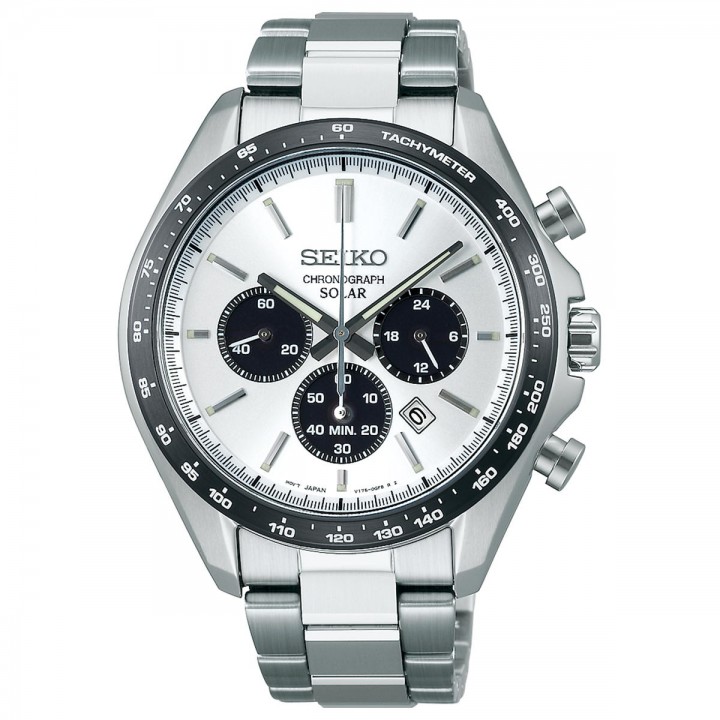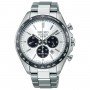 Seiko Selection SBPY165 - men's watch produced by Seiko. It is equipped with Japanese solar quartz movement and V175 calibre. Stainless steel case of round shape. Case dimensions are 42.2 mm. in diameter and 12.2 mm. in thickness. The dial of this Seiko watch is white. Display type: analog. This timepiece has sapphire, super clear coating glass. Stainless steel band, band color: silver. 100 m. water resistance. The watch is from Seiko Selection collection. The following features are equipped: date, chronograph, glowing hands, glowing markers, antimagnetic.