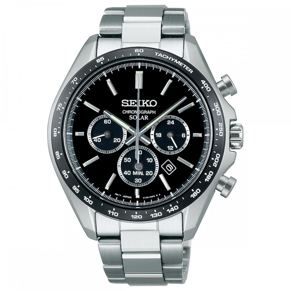 Seiko Selection SBPY167 - men's watch manufactured by Seiko. It is equipped with Japanese solar quartz movement and V175 calibre. Stainless steel case of round shape. Case dimensions are 42.2 mm. in diameter and 12.2 mm. in thickness. The dial of this Seiko watch is black. Display type: analog. This timepiece has sapphire, super clear coating glass. Stainless steel band, band color: silver. 100 m. water resistance. The watch is from Seiko Selection collection. The following features are equipped: date, chronograph, glowing hands, glowing markers, antimagnetic.