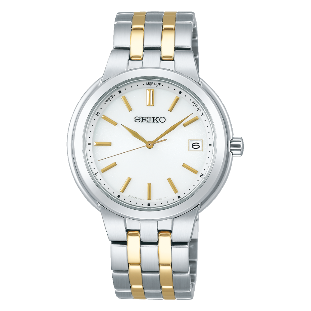 Seiko Selection SBTM285 - men's watch produced by Seiko. It has Japanese solar quartz movement and 7B62 calibre. Stainless steel case of round shape. Case dimensions are 37.7 mm. in diameter and 8.7 mm. in thickness. The dial of this Seiko watch is white. Display type: analog. This timepiece has sapphire glass. Stainless steel, gold plated band, band color: silver, gold. 100 m. water resistance. The watch is from Seiko Selection collection. The following features are equipped: antimagnetic, radio controlled, perpetual calendar, date.