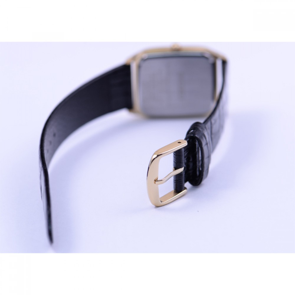 Seiko Selection SCDP040 - men's watch made by Seiko. It has Japanese quartz movement and 7N01 calibre. Stainless steel, gold plated case of rectangle shape. Case dimensions are 27 mm. in diameter and 6.4 mm. in thickness. The dial of this Seiko watch is gold. Display type: analog. This timepiece has sapphire glass. Leather band, band color: black. 100 m. water resistance. The watch is from Seiko Selection collection. The following features are equipped: antimagnetic.