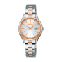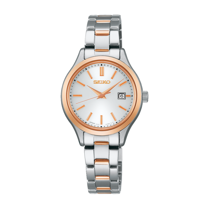 Seiko Selection Solar Limited Model STPX096 - ladies watch manufactured by Seiko. It is equipped with Japanese solar quartz movement and V137 calibre. Stainless steel, gold plated case of round shape. Case dimensions are 27.8 mm. in diameter and 7.3 mm. in thickness. The dial of this Seiko watch is silver, white. Display type: analog. This timepiece has sapphire glass. Stainless steel, gold plated band, band color: silver, gold. 100 m. water resistance. The watch is from Seiko Selection collection. The following features are equipped: antimagnetic, date.