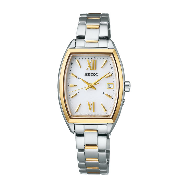 Seiko Selection Solar Limited Model SWFH128 - ladies watch produced by Seiko. It has Japanese solar quartz movement and 1B22 calibre. Stainless steel, gold plated case of tonneau shape. Case dimensions are 25 mm. in diameter and 8.2 mm. in thickness. The dial of this Seiko watch is white. Display type: analog. This timepiece has hardlex glass. Stainless steel, gold plated band, band color: silver, gold. 100 m. water resistance. The watch is from Seiko Selection collection. The following features are equipped: antimagnetic, date, radio controlled, perpetual calendar.