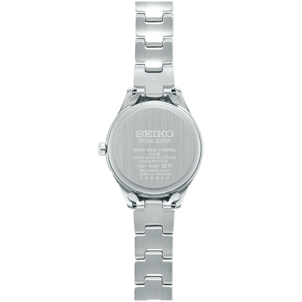 Seiko Selection Special Edition SWFH119 - ladies watch manufactured by Seiko. It has Japanese solar quartz movement and 1B21 calibre. Stainless steel case of round shape. Case dimensions are 28 mm. in diameter and 8.3 mm. in thickness. The dial of this Seiko watch is light blue. Display type: analog. This timepiece has hardlex glass. Stainless steel band, band color: silver. 100 m. water resistance. The watch is from Seiko Selection collection. The following features are equipped: antimagnetic, radio controlled, crystal set.