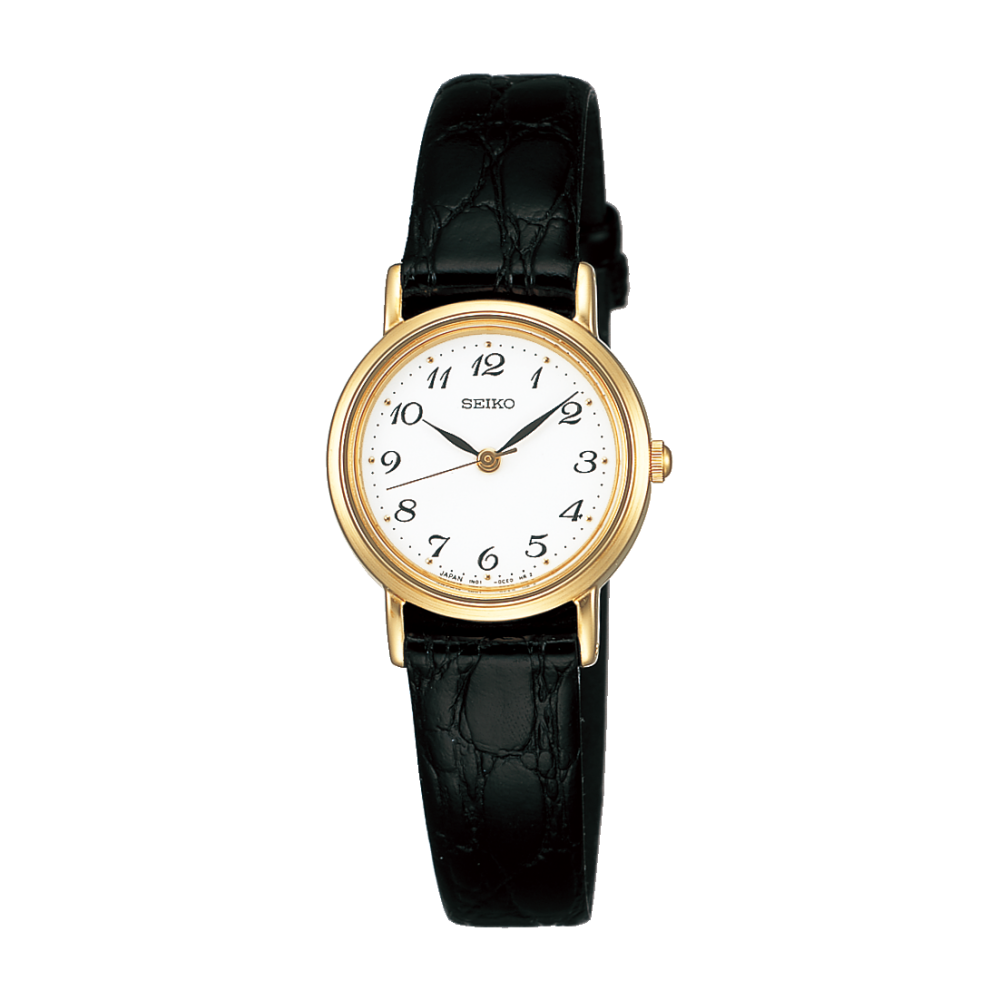 Seiko Selection SSDA030 - ladies watch made by Seiko. It has Japanese quartz movement and 1N01 calibre. Stainless steel, gold plated case of round shape. Case dimensions are 23.5 mm. in diameter and 5.7 mm. in thickness. The dial of this Seiko watch is white. Display type: analog. This timepiece has sapphire glass. Leather band, band color: black. 50 m. water resistance. The watch is from Seiko Selection collection. The following features are equipped: antimagnetic.