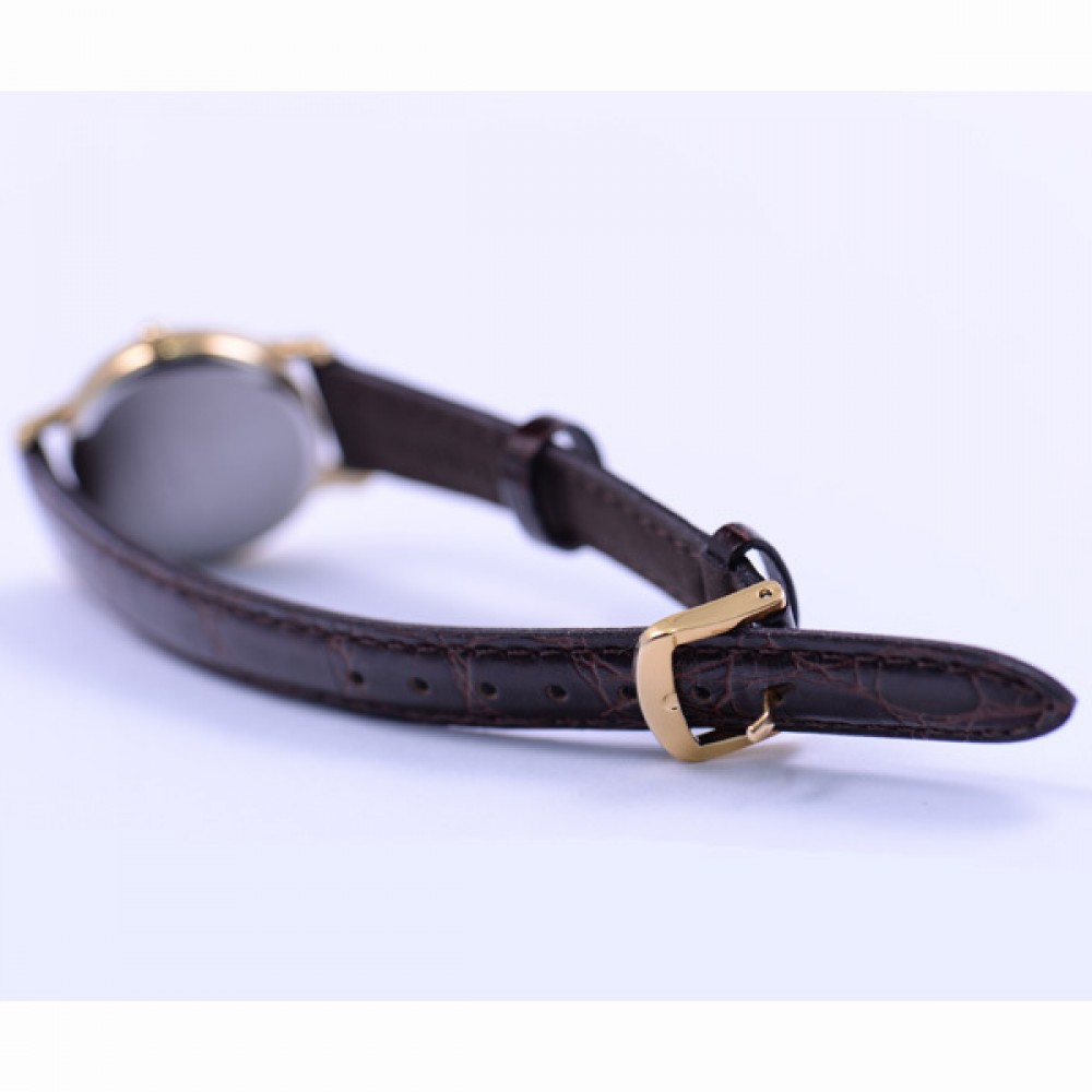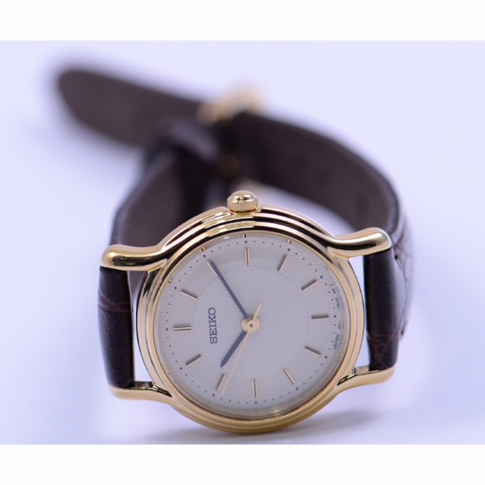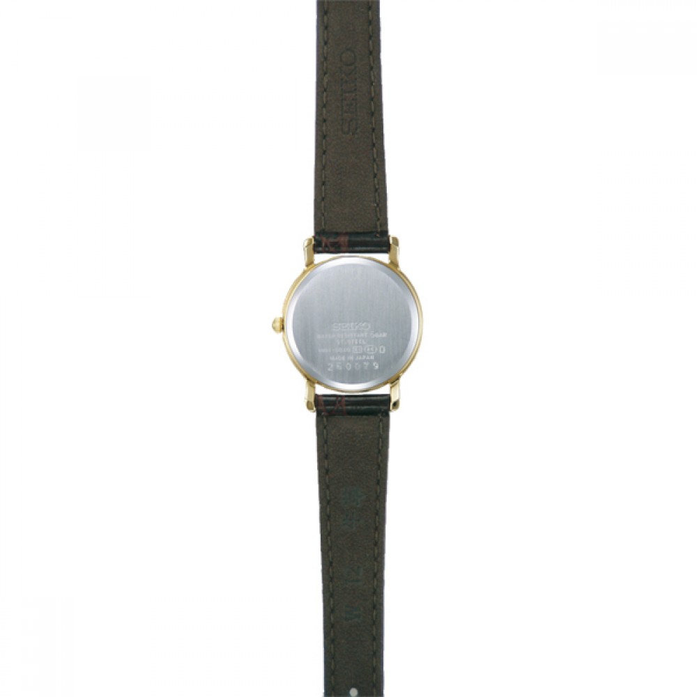 Seiko Selection SSDA034 - ladies watch made by Seiko. It is equipped with Japanese quartz movement and 1N01 calibre. Stainless steel, gold plated case of round shape. Case dimensions are 23.7 mm. in diameter and 5.6 mm. in thickness. The dial of this Seiko watch is gold. Display type: analog. This timepiece has sapphire glass. Leather band, band color: brown. 50 m. water resistance. The watch is from Seiko Selection collection. The following features are equipped: antimagnetic.