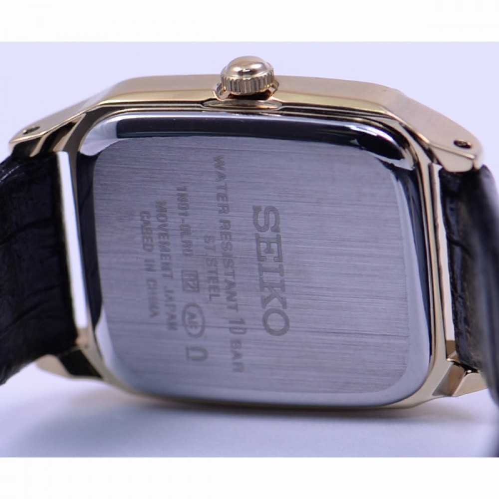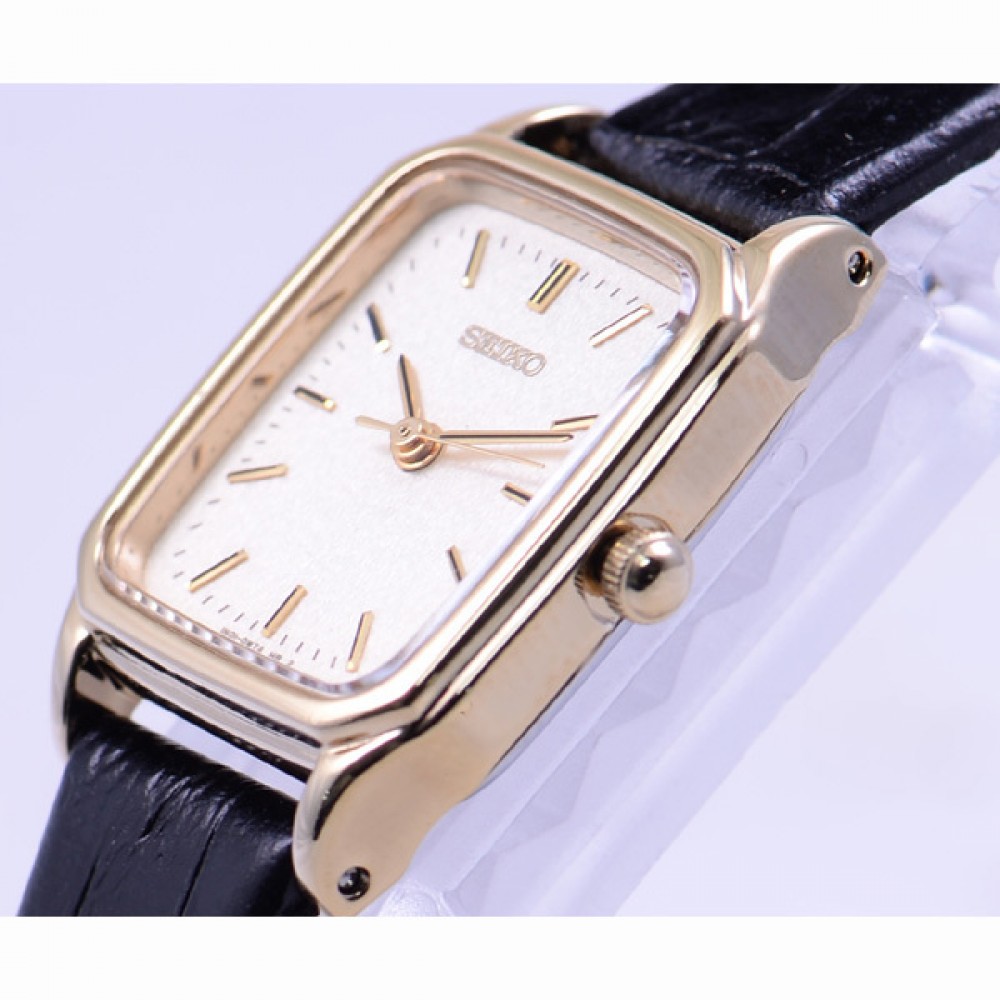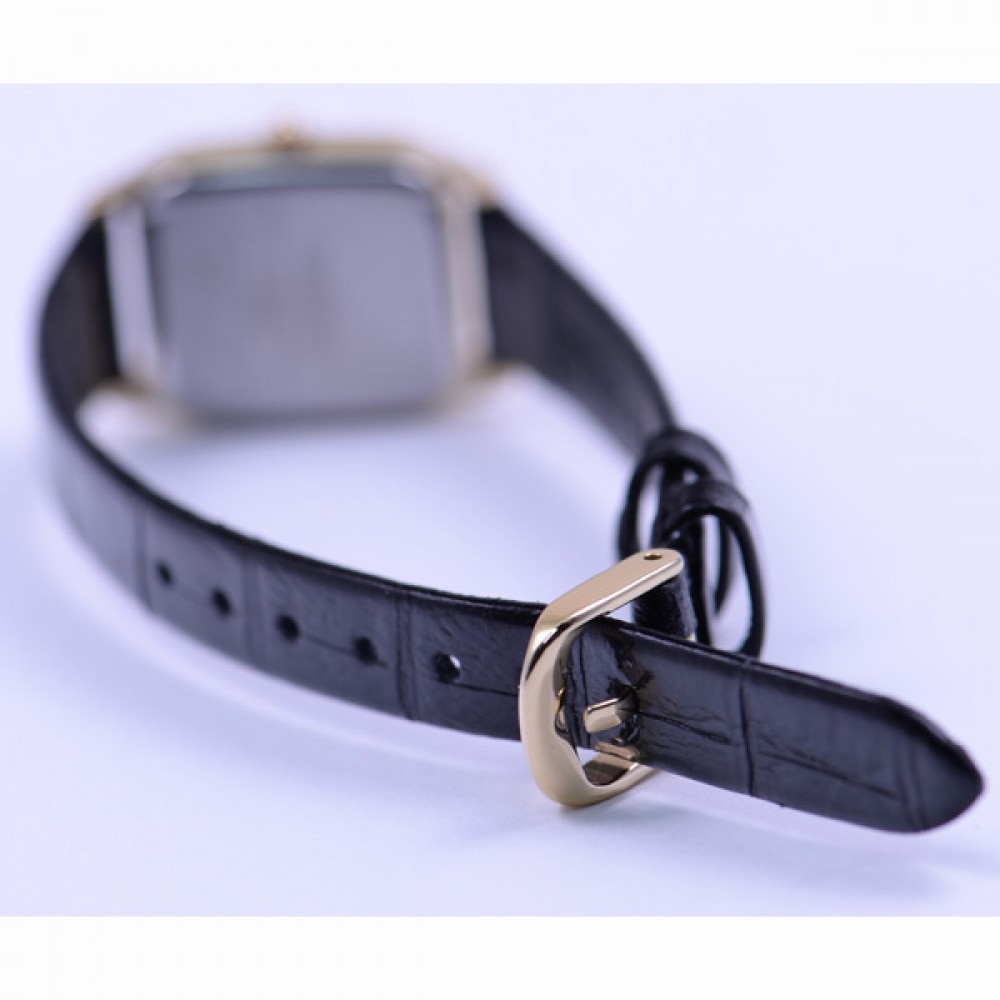 Seiko Selection SSDA080 - ladies watch manufactured by Seiko. It is equipped with Japanese quartz movement and 1N01 calibre. Stainless steel, gold plated case of rectangle shape. Case dimensions are 19.7 mm. in diameter and 5.8 mm. in thickness. The dial of this Seiko watch is gold. Display type: analog. This timepiece has sapphire glass. Leather band, band color: black. 100 m. water resistance. The watch is from Seiko Selection collection. The following features are equipped: antimagnetic.