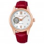 Seiko Selection SSDE012 - ladies watch made by Seiko. It has Japanese automatic movement and 4R38 calibre. Stainless steel, gold plated case of round shape. Case dimensions are 34.2 mm. in diameter and 10.8 mm. in thickness. The dial of this Seiko watch is silver, white. Display type: analog. This timepiece has hardlex glass. Leather band, band color: red. 100 m. water resistance. The watch is from Seiko Selection collection. The following features are equipped: antimagnetic, glowing hands, glowing markers, crystal set.