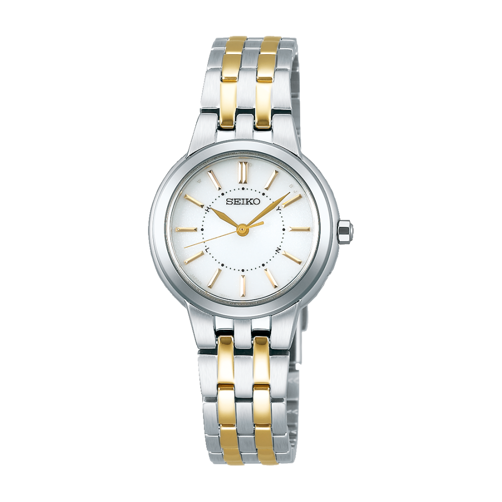 Seiko Selection SSDY035 - ladies watch manufactured by Seiko. It is equipped with Japanese solar quartz movement and 1B21 calibre. Stainless steel case of round shape. Case dimensions are 27 mm. in diameter and 7.9 mm. in thickness. The dial of this Seiko watch is white. Display type: analog. This timepiece has sapphire glass. Stainless steel, gold plated band, band color: silver, gold. 100 m. water resistance. The watch is from Seiko Selection collection. The following features are equipped: antimagnetic, radio controlled.