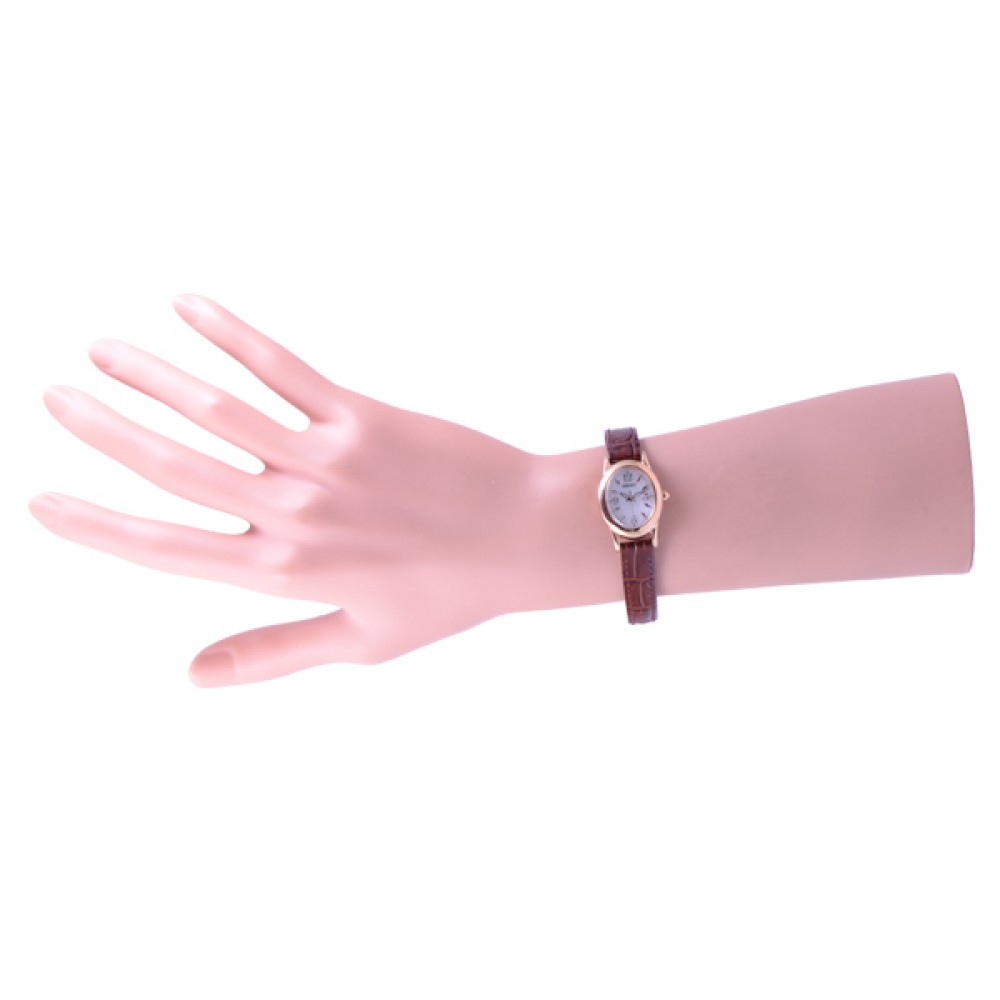 Seiko Selection SWFA148 - ladies watch made by Seiko. It is equipped with Japanese solar quartz movement and V117 calibre. Stainless steel, gold plated case of oval shape. Case dimensions are 20.3 mm. in diameter and 7.2 mm. in thickness. The dial of this Seiko watch is white. Display type: analog. This timepiece has hardlex glass. Leather band, band color: brown. 100 m. water resistance. The watch is from Seiko Selection collection. The following features are equipped: antimagnetic.