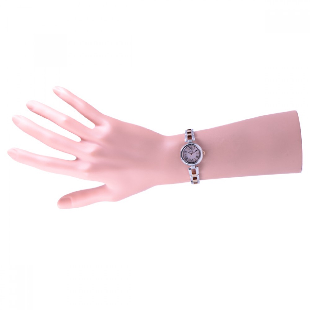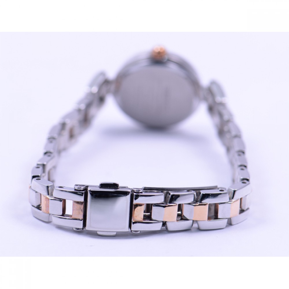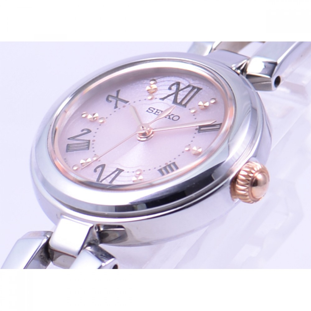 Seiko Selection SWFA153 - ladies watch manufactured by Seiko. It is equipped with Japanese solar quartz movement and V117 calibre. Stainless steel case of round shape. Case dimensions are 23 mm. in diameter and 6.6 mm. in thickness. The dial of this Seiko watch is pink. Display type: analog. This timepiece has hardlex glass. Stainless steel, gold plated band, band color: silver, gold. 100 m. water resistance. The watch is from Seiko Selection collection. The following features are equipped: antimagnetic.