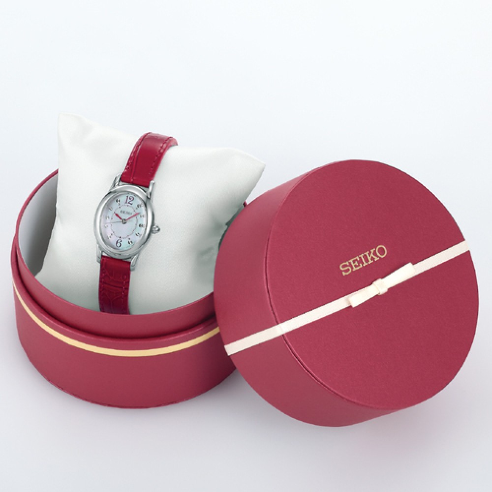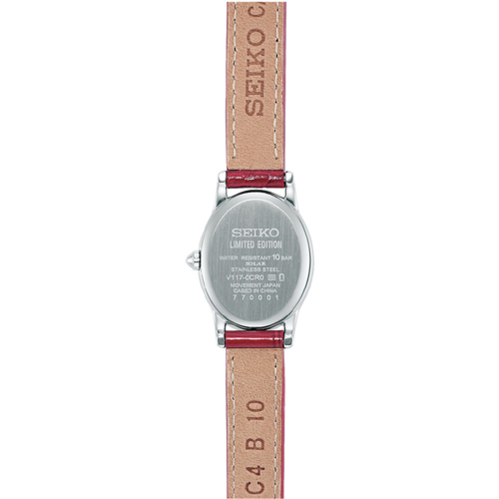 Seiko Selection SWFA175 - ladies watch manufactured by Seiko. It has Japanese solar quartz movement and V117 calibre. Stainless steel case of oval shape. Case dimensions are 20.3 mm. in diameter and 7.2 mm. in thickness. The dial of this Seiko watch is white. Display type: analog. This timepiece has hardlex glass. Leather band, band color: red. 100 m. water resistance. The watch is from Seiko Selection collection. The following features are equipped: antimagnetic, limited edition.