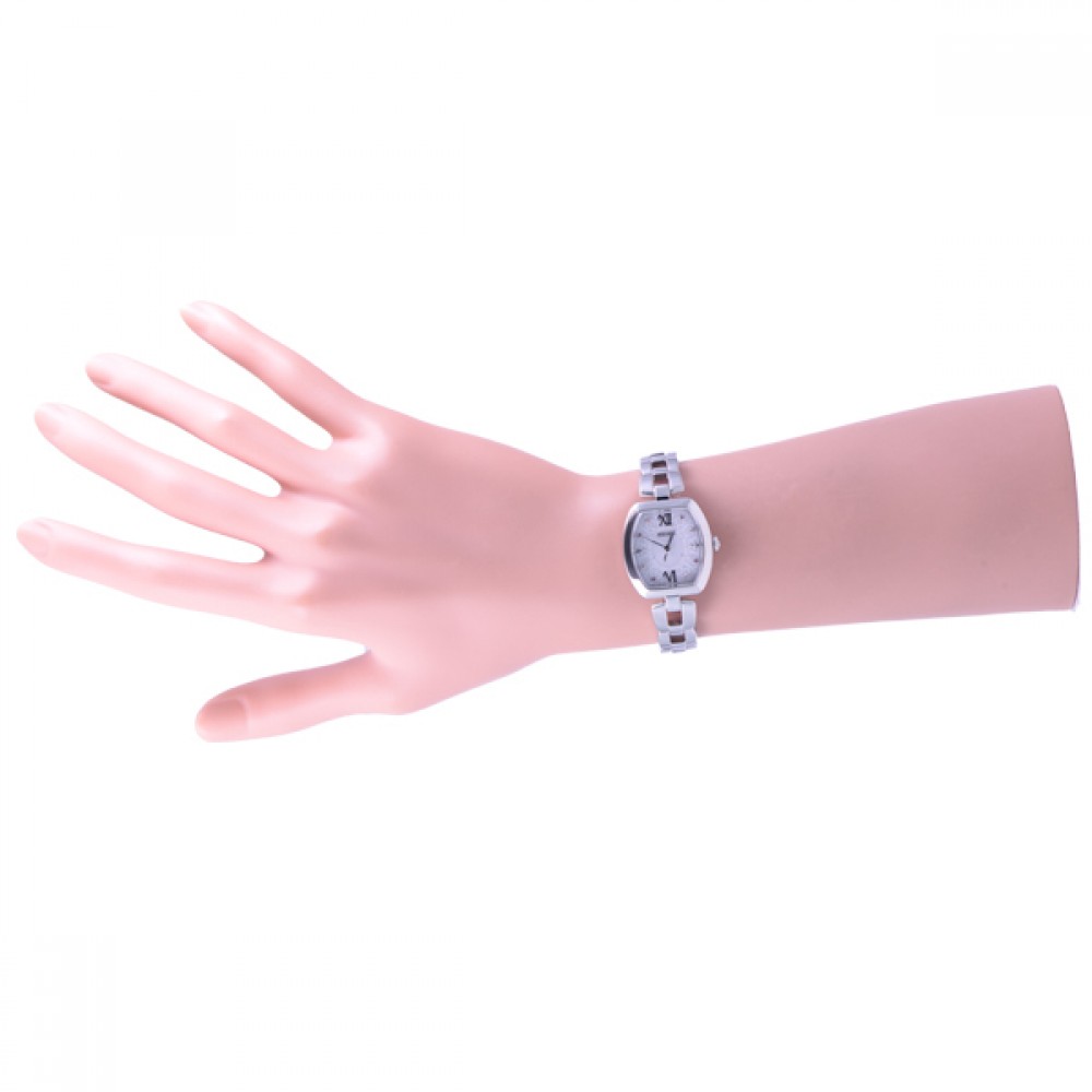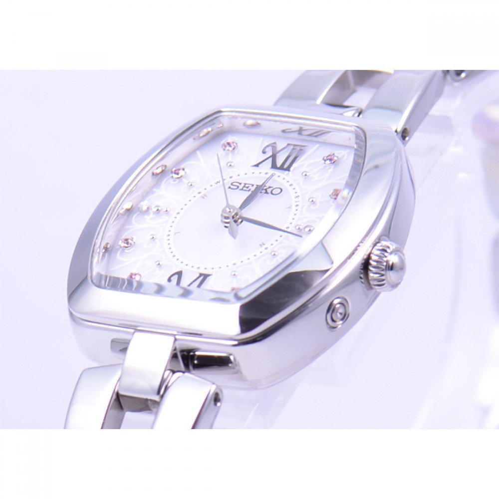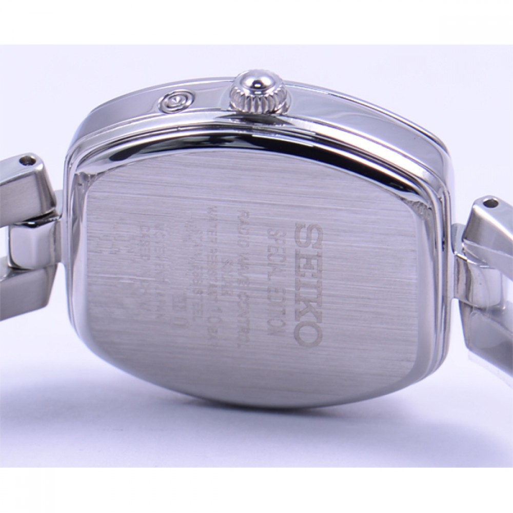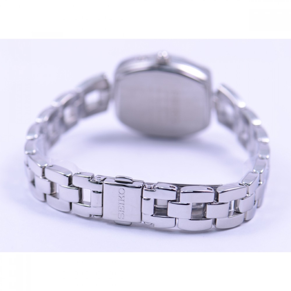 Seiko Selection SWFH035 - ladies watch produced by Seiko. It has Japanese solar quartz movement and 1B21 calibre. Stainless steel case of tonneau shape. Case dimensions are 24.8 mm. in diameter and 8.7 mm. in thickness. The dial of this Seiko watch is white. Display type: analog. This timepiece has hardlex glass. Stainless steel band, band color: silver. 100 m. water resistance. The watch is from Seiko Selection collection. The following features are equipped: antimagnetic, radio controlled, crystal set.