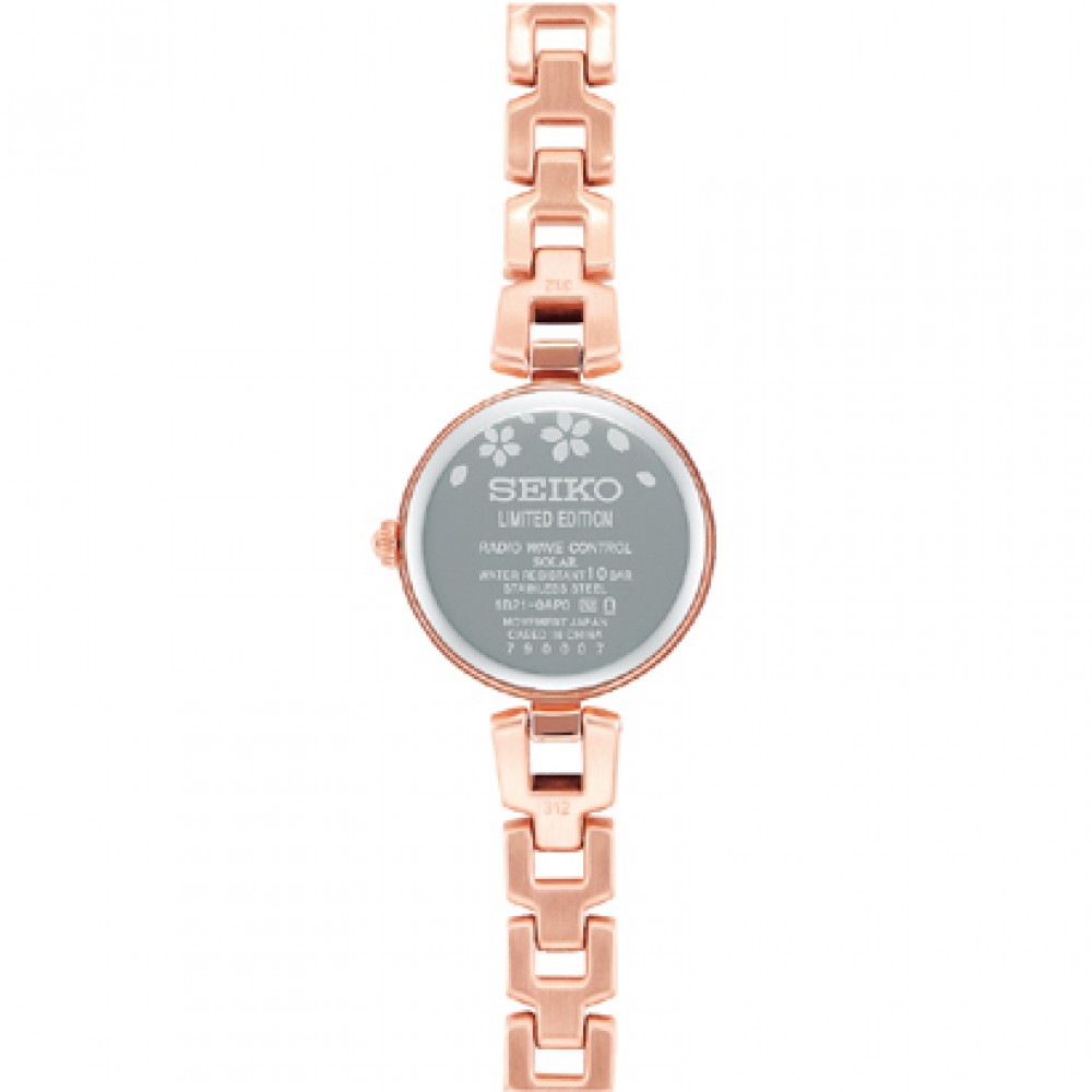 Seiko Selection SWFH094 - ladies watch manufactured by Seiko. It has Japanese solar quartz movement and 1B21 calibre. Stainless steel, gold plated case of round shape. Case dimensions are 25.2 mm. in diameter and 7.6 mm. in thickness. The dial of this Seiko watch is pink. Display type: analog. This timepiece has hardlex glass. Stainless steel, gold plated band, band color: gold. 100 m. water resistance. The watch is from Seiko Selection collection. The following features are equipped: limited edition, crystal set, radio controlled, antimagnetic.