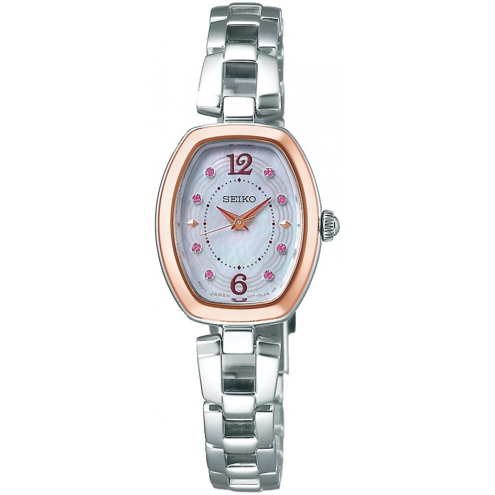 Seiko Selection Thanks MOM Special Limited 2019 SWFA184 - ladies watch produced by Seiko. It has Japanese solar quartz movement and V117 calibre. Stainless steel, gold plated case of tonneau shape. Case dimensions are 20.7 mm. in diameter and 6.7 mm. in thickness. The dial of this Seiko watch is mother of pearl. Display type: analog. This timepiece has hardlex glass. Stainless steel band, band color: silver. 100 m. water resistance. The watch is from Seiko Selection collection. The following features are equipped: antimagnetic, limited edition, crystal set.