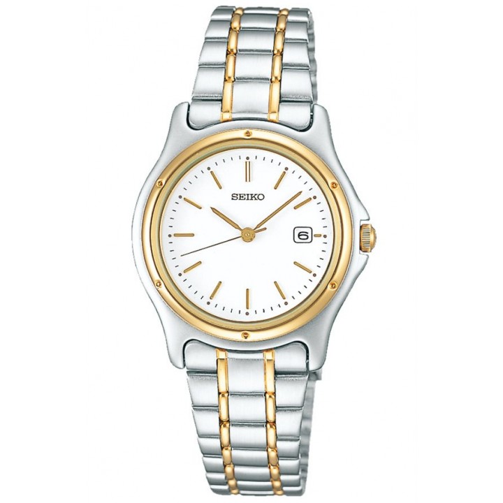 Seiko Spirit SSXV026 - ladies watch produced by Seiko. It is equipped with Japanese quartz movement and 7N82 calibre. Stainless steel, gold plated case of round shape. Case dimensions are 28.5 mm. in diameter and 6.4 mm. in thickness. The dial of this Seiko watch is white. Display type: analog. This timepiece has hardlex glass. Stainless steel, gold plated band, band color: silver, gold. 30 m. water resistance. The watch is from Spirit collection. The following features are equipped: date.