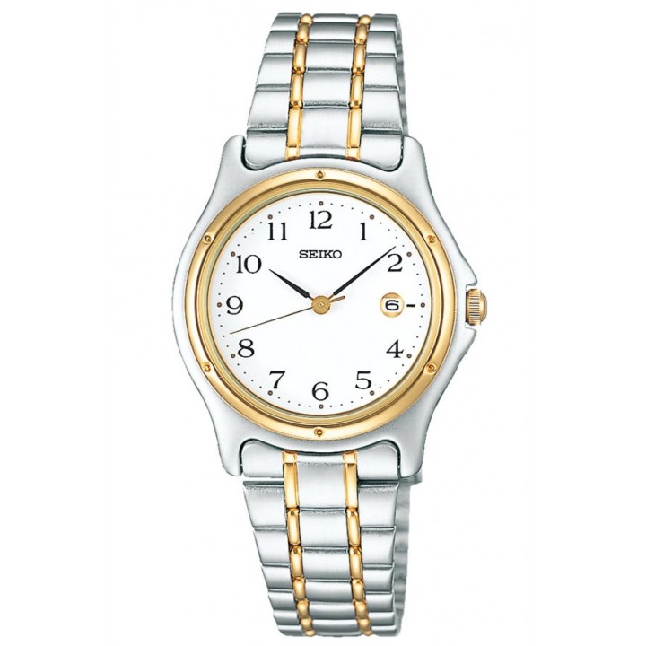 Seiko Spirit SSXV028 - ladies watch made by Seiko. It is equipped with Japanese quartz movement and 7N82 calibre. Stainless steel, gold plated case of round shape. Case dimensions are 28.5 mm. in diameter and 6.4 mm. in thickness. The dial of this Seiko watch is white. Display type: analog. This timepiece has hardlex glass. Stainless steel, gold plated band, band color: silver, gold. 30 m. water resistance. The watch is from Spirit collection. The following features are equipped: date.