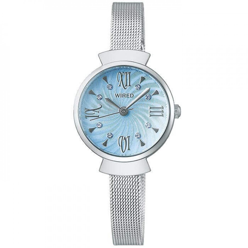 Seiko Wired F Candy Case AGEK457 - ladies watch produced by Seiko. It has Japanese quartz movement and VJ21 calibre. Stainless steel case of round shape. Case dimensions are 25 mm. in diameter and 7.9 mm. in thickness. The dial of this Seiko watch is blue. Display type: analog. This timepiece has hardlex glass. Stainless steel band, band color: silver. 30 m. water resistance. The watch is from Wired collection. The following features are equipped: crystal set.
