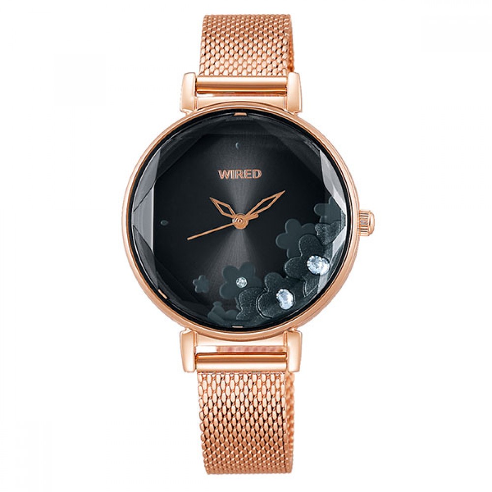 Seiko Wired F Shiny Flower AGEK450 - ladies watch produced by Seiko. It has Japanese quartz movement and VJ21 calibre. Stainless steel, gold plated case of round shape. Case dimensions are 31.4 mm. in diameter and 8.7 mm. in thickness. The dial of this Seiko watch is black. Display type: analog. This timepiece has hardlex glass. Stainless steel, gold plated band, band color: gold. 50 m. water resistance. The watch is from Wired collection. The following features are equipped: crystal set.