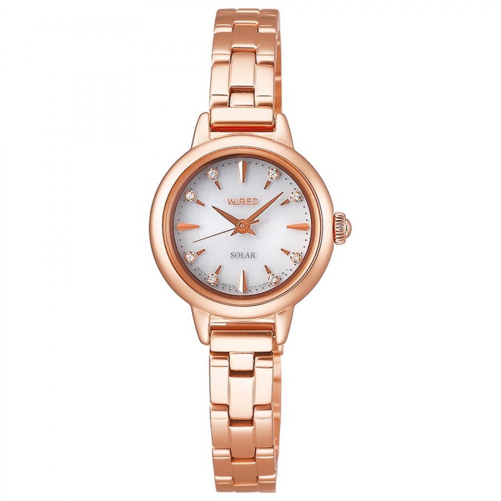 Seiko Wired F Solar AGED106 - ladies watch manufactured by Seiko. It is equipped with Japanese solar quartz movement and V117 calibre. Stainless steel, gold plated case of round shape. Case dimensions are 23 mm. in diameter and 6.8 mm. in thickness. The dial of this Seiko watch is white, silver. Display type: analog. This timepiece has hardlex glass. Stainless steel, gold plated band, band color: gold. 50 m. water resistance. The watch is from Wired collection. The following features are equipped: crystal set.