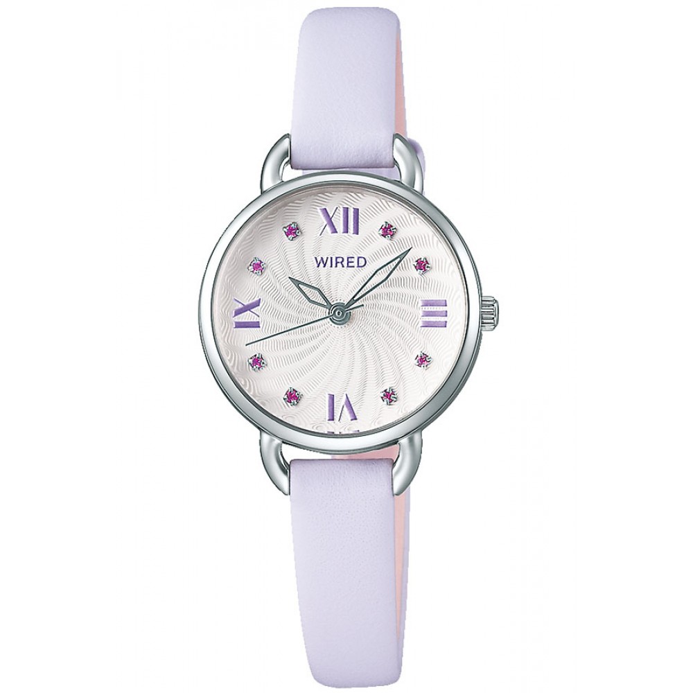 Seiko Wired F Tokyo Girl Mix AGEK444 - ladies watch manufactured by Seiko. It is equipped with Japanese quartz movement and VC01 calibre. Stainless steel case of round shape. Case dimensions are 25 mm. in diameter and 7.3 mm. in thickness. The dial of this Seiko watch is silver. Display type: analog. This timepiece has mineral glass. Leather band, band color: purple. 30 m. water resistance. The watch is from Wired collection. The following features are equipped: crystal set.