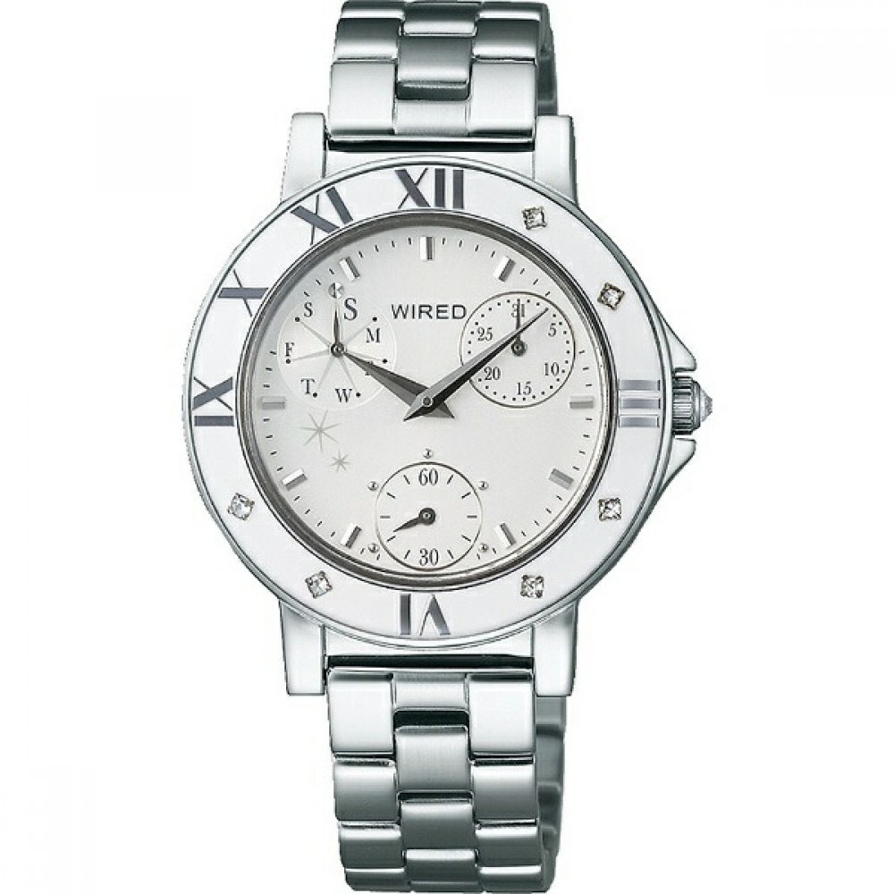 Seiko Wired F Tokyo Girl Mix AGET403 - ladies watch produced by Seiko. It is equipped with Japanese quartz movement and VD76 calibre. Stainless steel case of round shape. Case dimensions are 33 mm. in diameter and 8.6 mm. in thickness. The dial of this Seiko watch is white. Display type: analog. This timepiece has mineral glass. Stainless steel band, band color: silver. 30 m. water resistance. The watch is from Wired collection. The following features are equipped: date, day, crystal set.