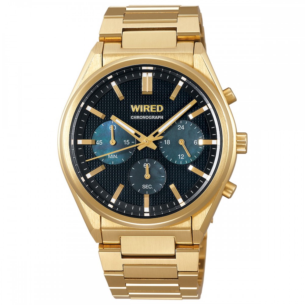 Seiko Wired Reflection AGAT442 - men's watch produced by Seiko. It has Japanese quartz movement and VD54 calibre. Stainless steel, gold plated case of round shape. Case dimensions are 39.4 mm. in diameter and 10.3 mm. in thickness. The dial of this Seiko watch is black, mother of pearl. Display type: analog. This timepiece has hardlex glass. Stainless steel, gold plated band, band color: gold. 100 m. water resistance. The watch is from Wired collection. The following features are equipped: glowing hands, glowing markers, chronograph.