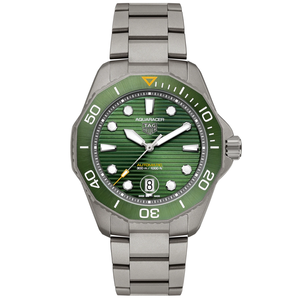 Tag Heuer Aquaracer Professional 300 Date Titanium WBP208B.BF0631 - men's watch produced by Tag Heuer. It is equipped with Japanese automatic movement and Calibre 5 calibre. Titanium, ceramic case of round shape. Case dimensions are 43 mm. in diameter. The dial of this Tag Heuer watch is green. Display type: analog. This timepiece has sapphire, antireflection coating glass. Titanium band, band color: silver. 300 m. water resistance. The watch is from Aquaracer collection. The following features are equipped: date, glowing hands, glowing markers.