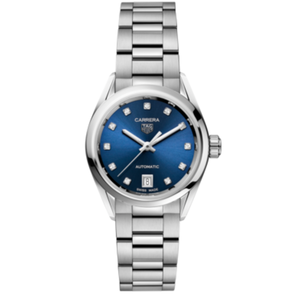 Tag Heuer Carrera Date WBN2413.BA0621 - ladies watch made by Tag Heuer. It is equipped with Japanese automatic movement and Calibre 9 calibre. Stainless steel case of round shape. Case dimensions are 29 mm. in diameter and 10.75 mm. in thickness. The dial of this Tag Heuer watch is mother of pearl. Display type: analog. This timepiece has sapphire, antireflection coating glass. Stainless steel band, band color: silver. 100 m. water resistance. The watch is from Carrera collection. The following features are equipped: glowing hands, date, diamond set.